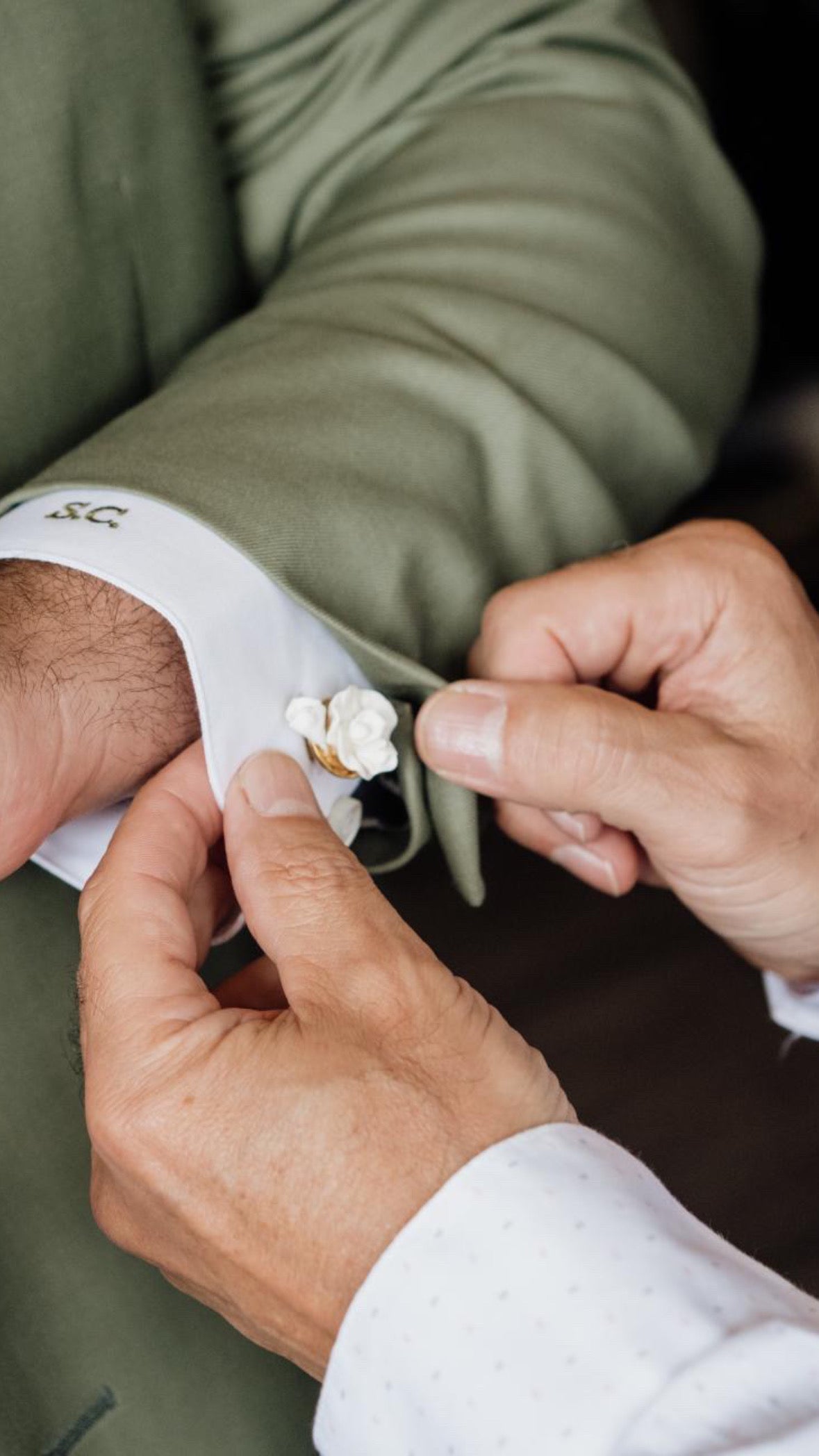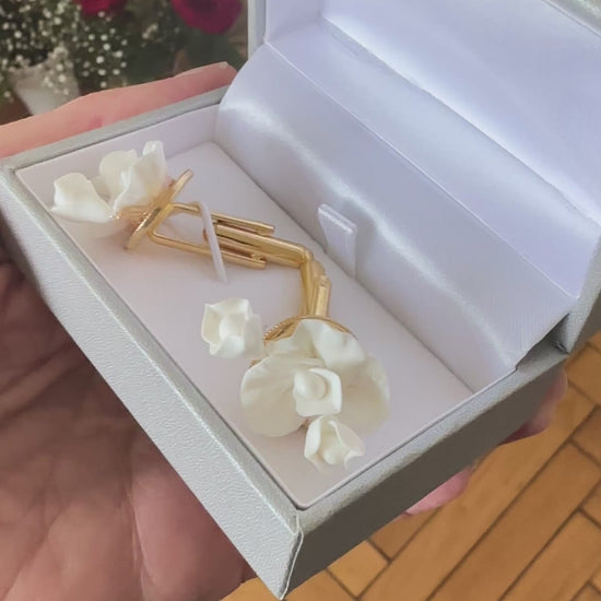 Sublimez votre tenue de mariage avec ces élégants boutons de manchette arisanaux. Chaque fleur est délicatement sculptée à la main en porcelaine froide, créant une pièce unique pour votre jour spécial.