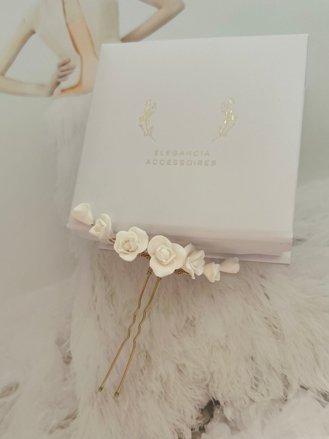 Sublimez votre coiffure de mariée avec cette épingle à chignon florale entièrement réalisée à la main, pétale par pétale, en porcelaine froide.